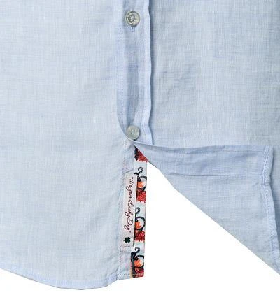 Extras: Ärmeluntertrittskante mit Kontrastmaterial eingefasst, Innere Manschette aus Kontrastmaterial, Kragensteg aus Kontrastmaterial, Saum mit Keileinsatz in der Seitennaht, Untertritt der Knopfleiste mit Kontrastmaterial eingefasst